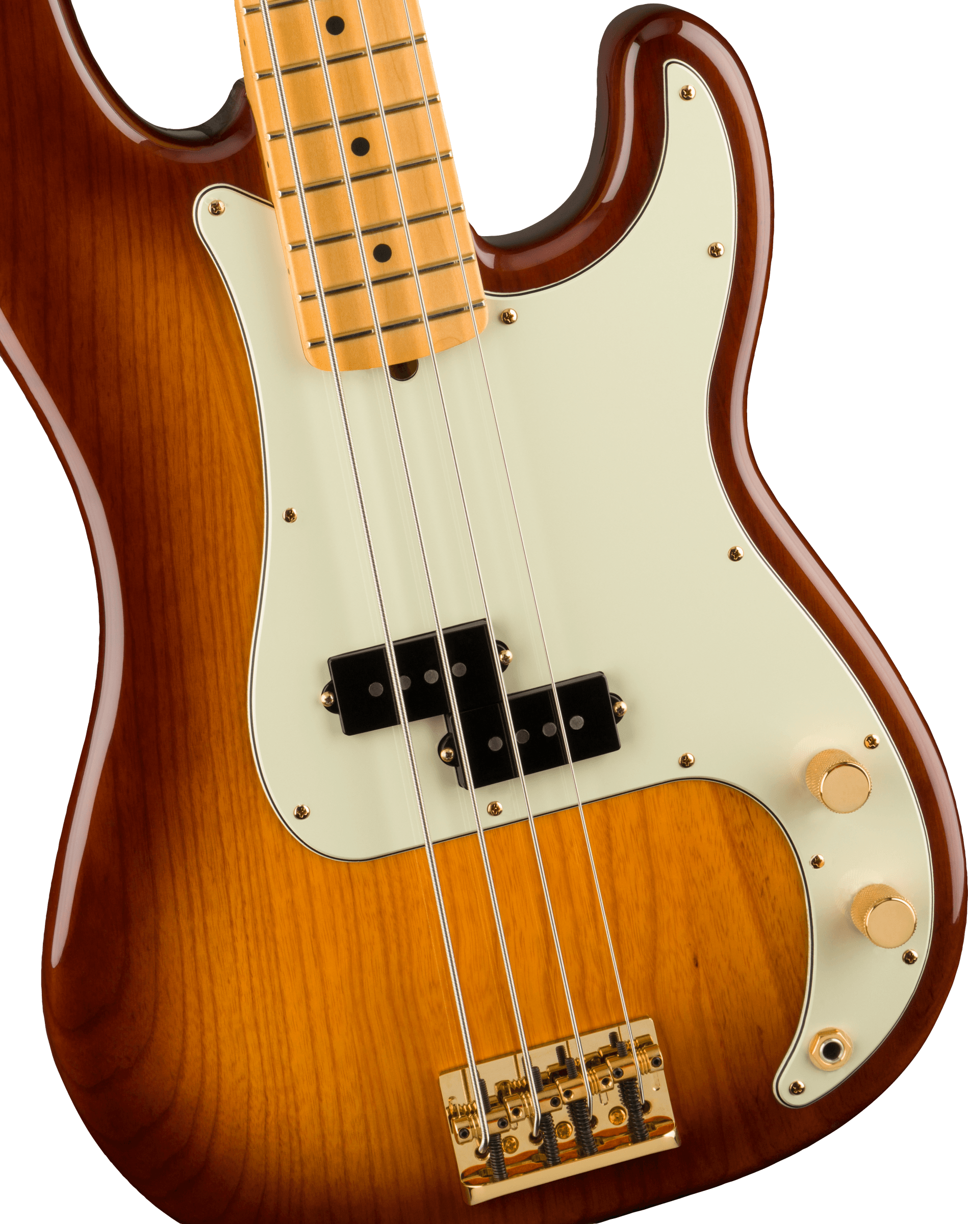 The 75th Anniversary Commemorative Precision Bass is decked out in a beautiful 2-Color Bourbon Burst finish over an ash body with gold hardware. The one-piece maple neck features a ’63 Precision Bass neck profile, rolled fingerboard edges, a “Super-Natural” satin finish and a sculpted neck heel for unsurpassed comfort and playability. Custom Shop ’62 P Bass pickups serve up vintage-style low-end and punch while the HiMass™ Vintage bridge enhances sustain, resonance and stability. Finally, every Commemorative Precision Bass features special badging with a 75th anniversary ingot inlaid into the back of the headstock and an engraved anniversary neck plate.