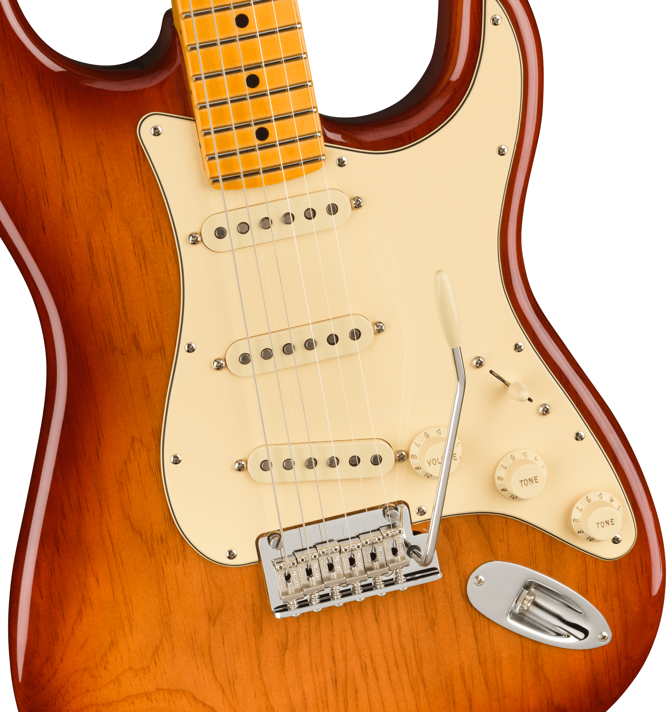 Our popular Deep “C” neck now sports smooth rolled fingerboard edges, a “Super-Natural” satin finish and a newly sculpted neck heel for a supremely comfortable feel and easy access to the upper register. New V-Mod II Stratocaster single-coil pickups are more articulate than ever while retaining bell-like chime and warmth. An upgraded 2-point tremolo with a cold-rolled steel block increases sustain, clarity and high-end sparkle.