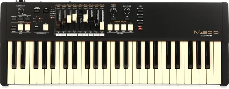 Made for organists on the go, the Hammond M-Solo is the most compact, travel-friendly Hammond ever made. This pint-sized, 49-key powerhouse may have a small footprint, but it boasts a great big sound that organists will love! The M-Solo covers the bases of classic organs with a knockout B-3 tonewheel organ, three transistor organs, and nine drawbars. It includes a ’70s-style string machine and a dual-oscillator polyphonic synth to give you even more flexibility onstage and in the studio. A digital Leslie speaker simulation and onboard effects, including delay, reverb, overdrive, and chorus, round out the M-Solo’s impressive sonic package. A perfect complement to your current keyboard rig or just a fun travel-sized solution, the Hammond M-Solo is a mighty mini organ with a mega tone!